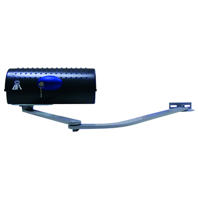 Elektromechanischer 24 V-Drehtorantrieb mit Gelenkarmen und abschließbarer Notentriegelung. Selbsthemmend in Öffnung und Schließung. Einsetzbar bis 2,00 m Flügellänge mit max. 250 kg Torgewicht oder bis 2,50 m Flügellänge und max. 200 kg